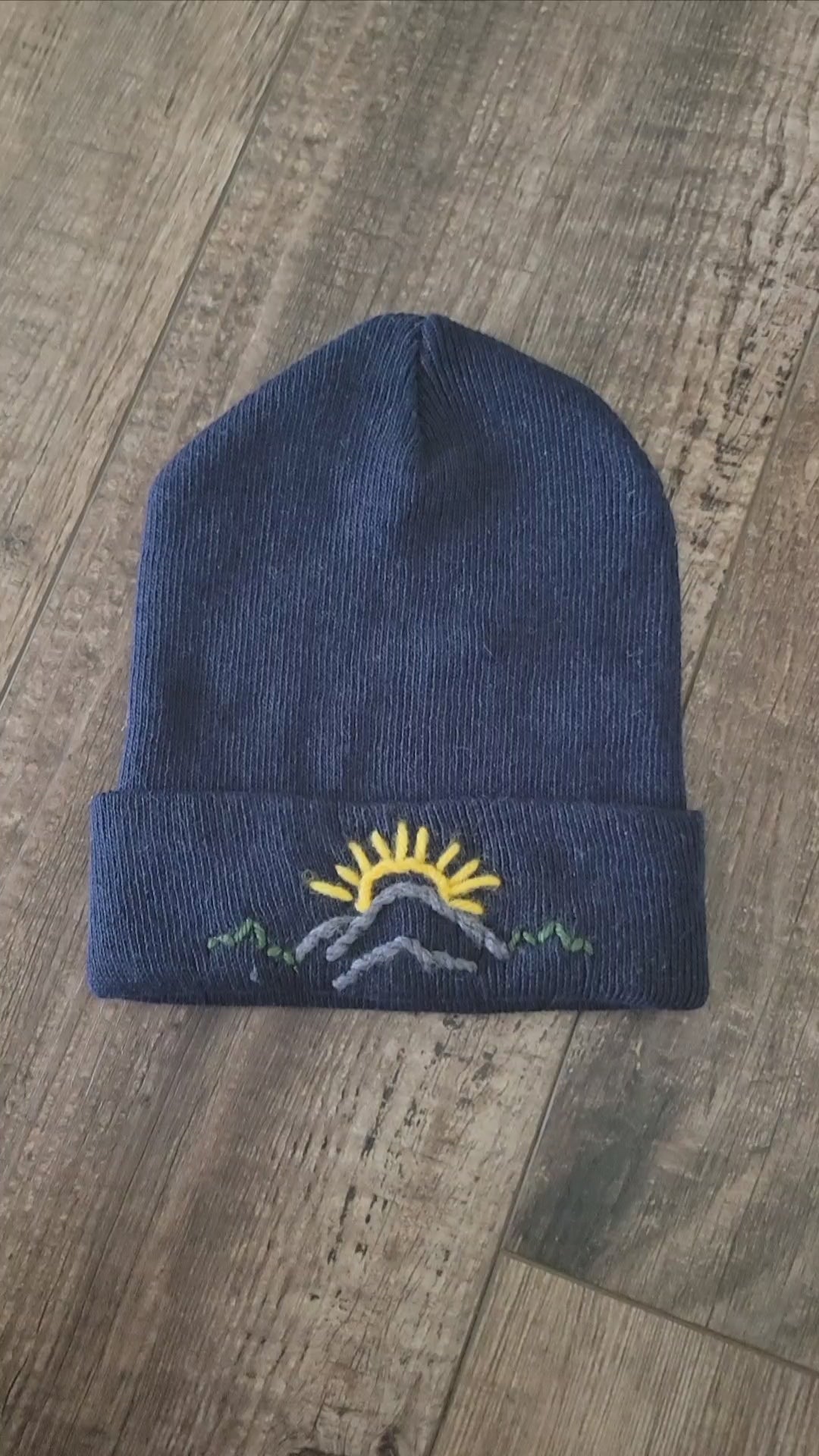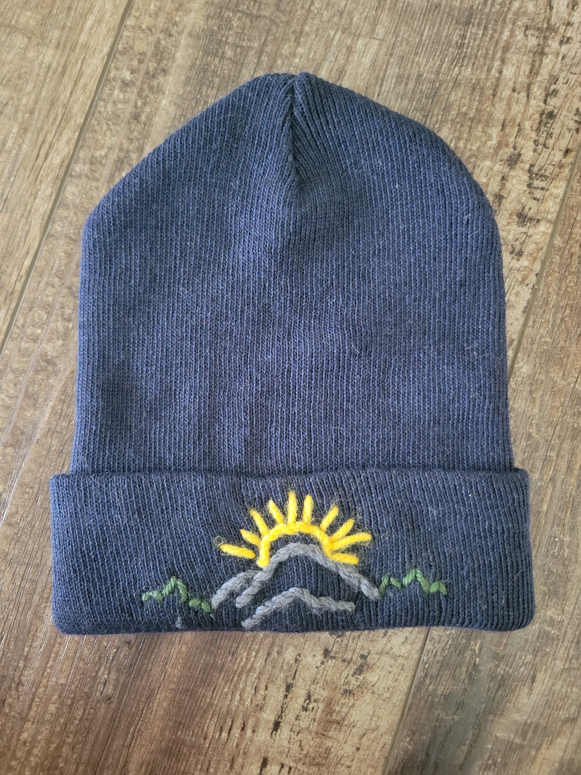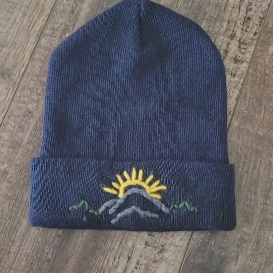 Adventure meets warmth in this cozy winter hat, featuring a hand-embroidered design of mountains, trees, and the sun. Each stitch captures the beauty of the great outdoors, making it perfect for nature lovers big and small. Soft, snug, and full of character, this hat brings a little wilderness charm to every chilly day.